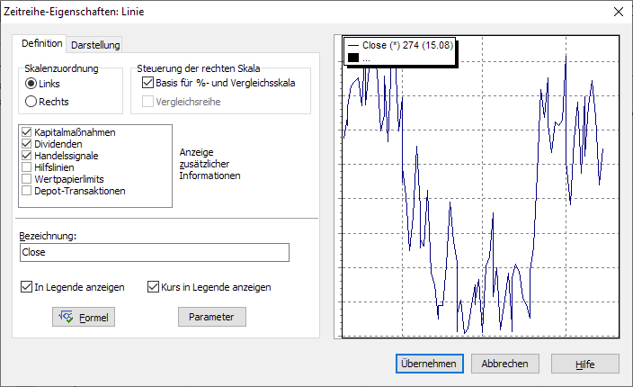 Unter der Registerkarte "Definition" finden Sie neben Zuordnung, und Parametereinstellungen auch die Skalenzuordnung und die Anzeige zusätzlicher Informationen (wie Dividenden, Kapitalmaßnahmen usw.).