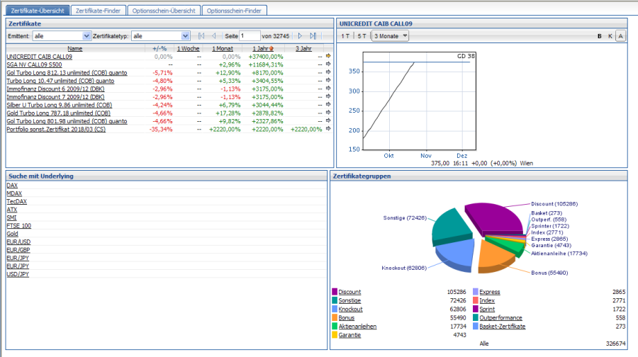 Zertifikateübersicht im Finder Derivate (Online)