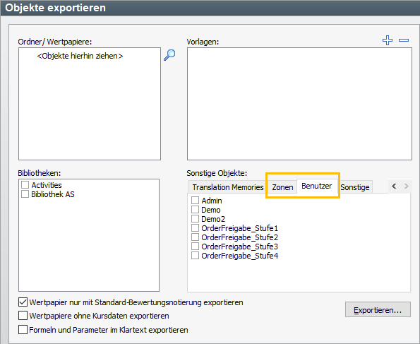 - Im sich öffnenden Worksheet "Objekte exportieren" können Sie die Benutzerverwaltungsobjekte angeben, die Sie exportieren möchten. Sie finden diese im Bereich "Sonstige Objekte" auf den neuen Registerkarten "Zonen" und "Benutzer", auf denen Sie die zu exportierenden Zonen und Benutzer einzeln auswählen können.