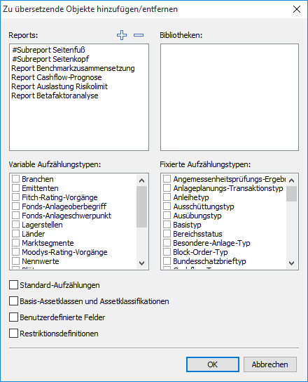 Zu geöffneten Translation Memories können Sie Objekte hinzufügen und auch wieder entfernen. Solche Objekte können z. B. Reports, Bibliotheken oder Aufzählungstypen aus der Datenbank sein.