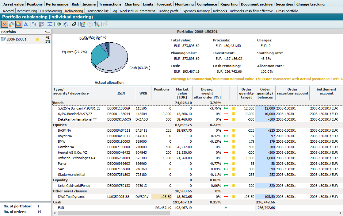 To do this, either open an "empty" template via the ribbon as described above and drag portfolios into the portfolio list or open the workspace of a portfolio, a holder, a group or a portfolio filter and switch to the "Transactions" worksheet and then to "Rebalancing" (or "Reallocation").