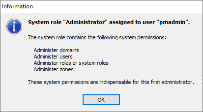If everything has worked, the next dialog box appears, informing you that the user with the "Administrator" system role has been successfully created with all the necessary system rights in the user administration: