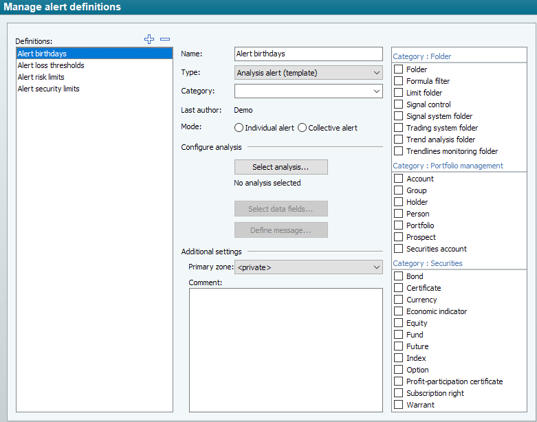 Object type | On the right-hand side of the worksheet, you can determine for which object types the alert definition should be available by selecting the corresponding checkboxes. |