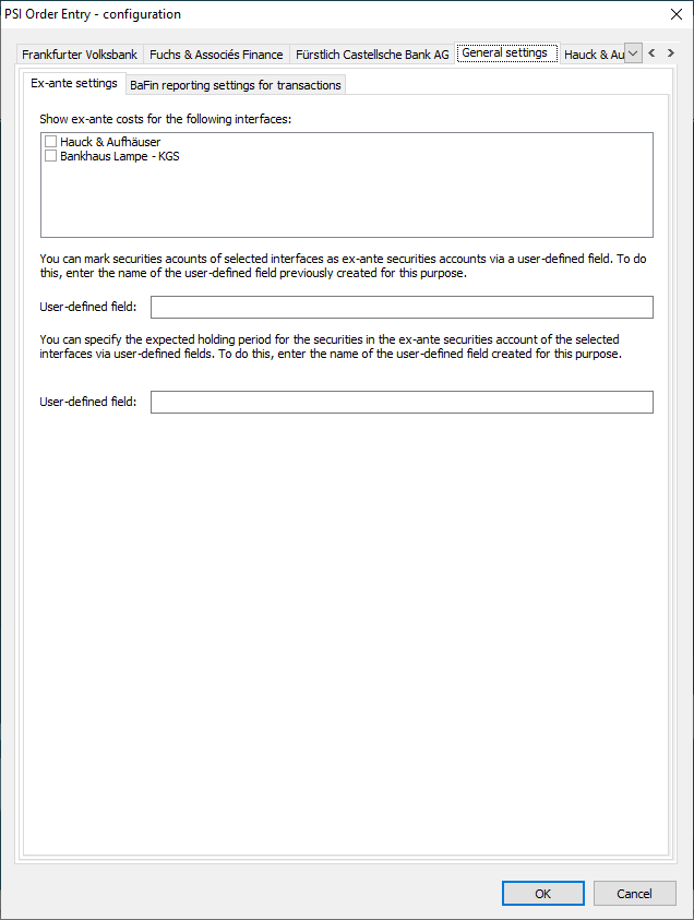 User-defined field for "Holding period" | You can enter an expected holding period for the securities in the ex ante securities accounts of the interfaces selected above via a user-defined field. To do this, enter the name of the user-defined field created for this purpose in the input field below. |