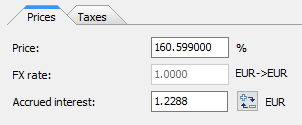 If the bond to be purchased is an index-linked bond, the "Price" field in the "Purchase" dialog box shows the market price without offsetting the index ratio. The "Accrued interest" field shows the accrued interest actually paid or payable (i.e. with the index ratio calculated).