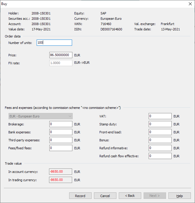 The second page appears, on which you enter the further details of the transaction. At the top you will find the information transferred from the first page of the dialog window (holder, custody account, account, security...). If you have licensed the "Cost service" module and have an Internet connection to the service, you can download the associated costs of the purchase directly from the cost service using the corresponding button.
