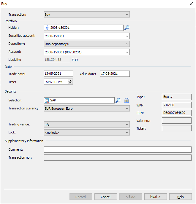 You can also see the type, valuation currency, WKN, ISIN, security number and ticker of the security as information in the dialog windows for entering transactions on the right.