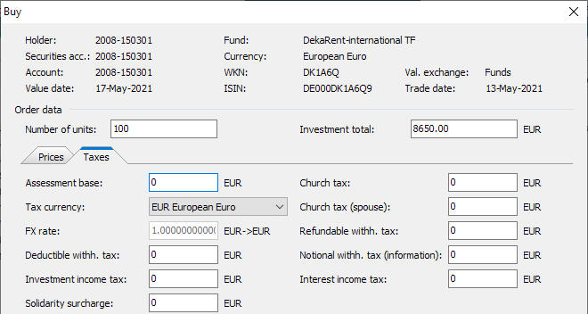 For bonds and funds, all tax-relevant fields are also required for purchases due to interim profit or accrued interest. In this case, the assessment basis is the interim profit or accrued interest converted into the tax currency. The tax details largely correspond to those for recording income from securities. You can access the data by clicking on the "Taxes" mini-tab on the second page of the "Purchase" dialog box.