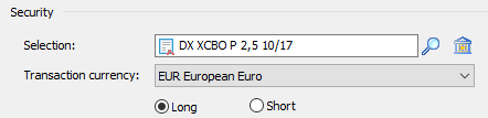 Enter the name of the security for which the selected transaction is to be executed and press <RETURN> or select the "Search" icon to search for the security using the object search.