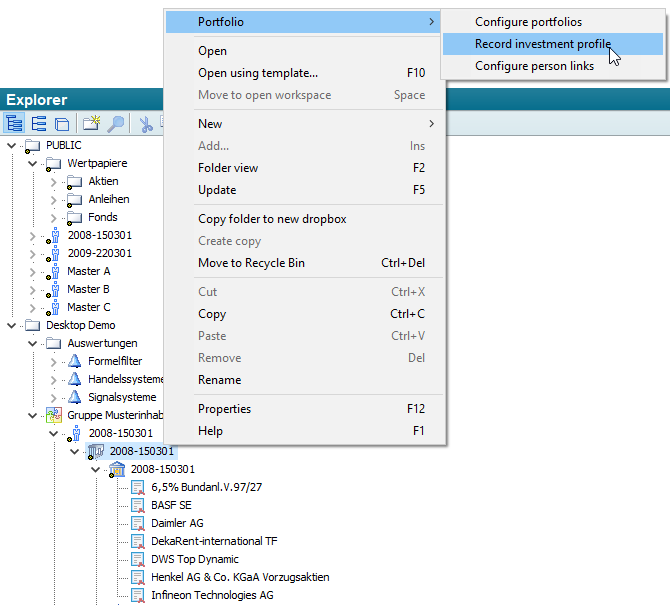 - In the Explorer, select the command PORTFOLIO, CREATE INVESTMENT PROFILE in the context menu of the portfolio.