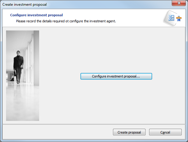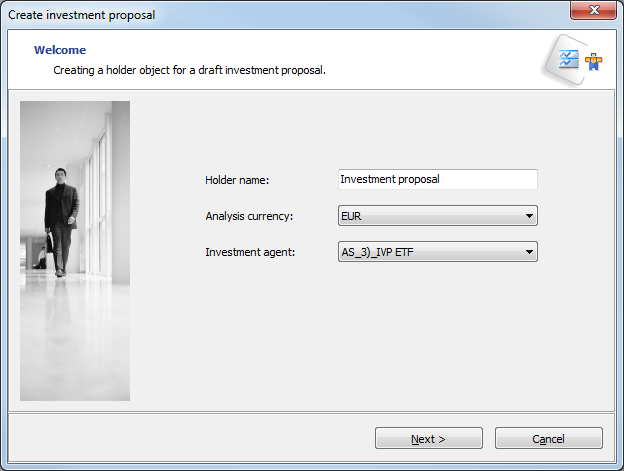 This wizard is used to create an investment proposal in the form of a new (private) holder with an initial portfolio corresponding to the proposal. It essentially requires an investment amount as input.