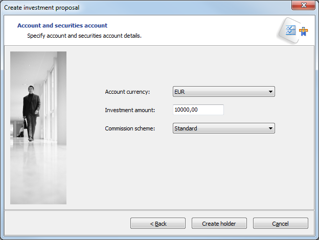 - Then click the "Next" button to switch to the next page of the wizard, where you can specify further data (account currency, investment amount and underlying commission scheme) for the account and custody account of the holder to be created.