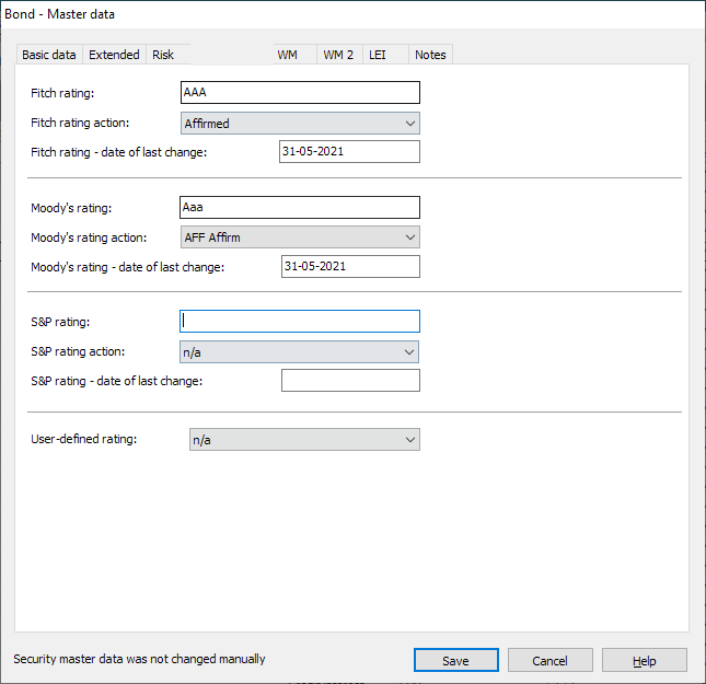 In the bond master data, you will find all rating information on the "Credit rating" tab.
