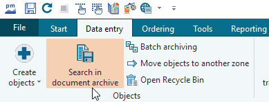 You can open the document archive via the "Search document archive" icon on the "Data maintenance" tab. In this case, no securities account object is initially selected and you can use the search area to select the desired holder (or group, portfolio, interested party, securities account or account) and search for their documents.