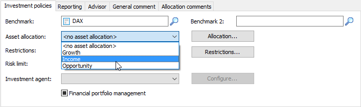 To cancel the assignment of a model to a portfolio version, select the list entry "<no asset allocation>" in the "Asset allocation" field.