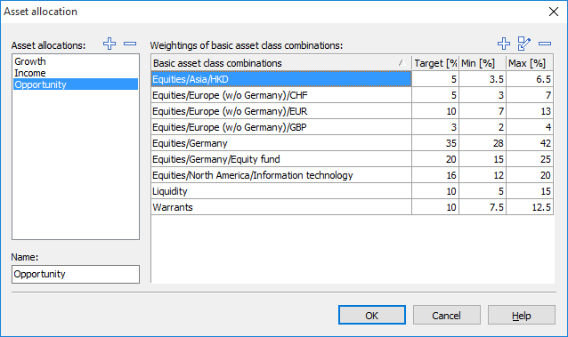 You can edit the predefined asset allocation models to adapt them to your needs, use the "Copy" function to quickly create and edit variants or even create completely new asset allocation models.