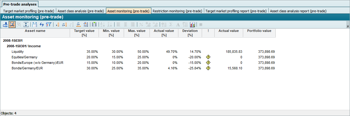 ! | A warning sign is displayed in this table column if the deviation exceeds the permissible tolerance range. There is therefore a need for action here, as the investment strategy is no longer fulfilled by the current market prices. |
