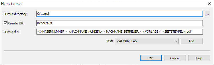 Optionally, you can also pack the exported files into a ZIP archive. To do this, activate the "Pack in ZIP" checkbox and enter the desired name for the ZIP archive in the corresponding input field. It is important that the file extension is ".7z". For the name of the ZIP archive, you can also use the predefined blocks or define new name components via the <FORMULA> entry, similar to the name of the output file below. For further details, read the chapter Saving reports in ZIP archives.