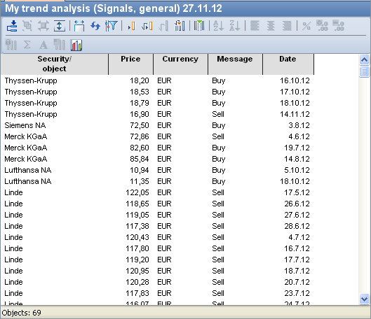 Once you have created a trend analysis folder and inserted the securities under it, you can carry out the analysis. This allows you to display all signals for these securities over a certain period of time.