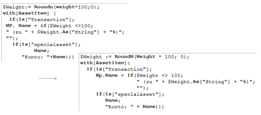 Select the key combination <CTRL>+<Q> or the command EDIT, FORMATTING HINT UNDERRETURN in the main menu of the formula editor to prevent deeply nested expressions from moving too far to the right during automatic formatting (auto-formatter). {...} is inserted at the end of the line.