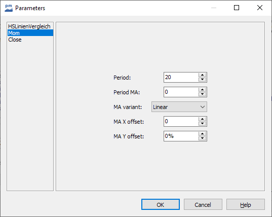 Select the "Parameters" button. Optionally, select the PARAMETERS command directly in the context menu of the price history. The "Parameters" dialog box opens. The calculation methods of the basic trading systems or, if necessary, the definition of the lines can be changed here. You will find detailed explanations of the parameters of the technical indicators in the List of indicatorssection.