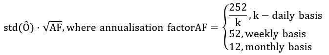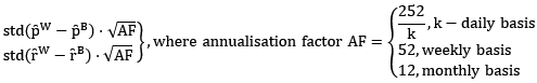 The tracking error is defined as the annualized standard deviation over n sample periods of the difference time series of security performance and underlying security performance (see preliminary remarks).