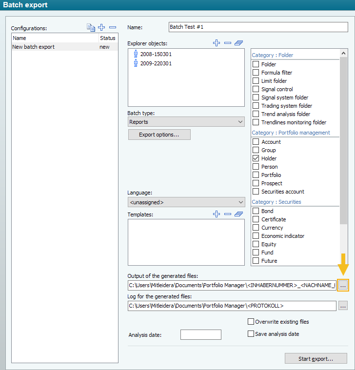 In the "Batch export" worksheet, you will then see the resulting path in the "Output of generated files" field.