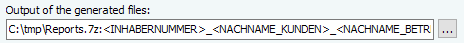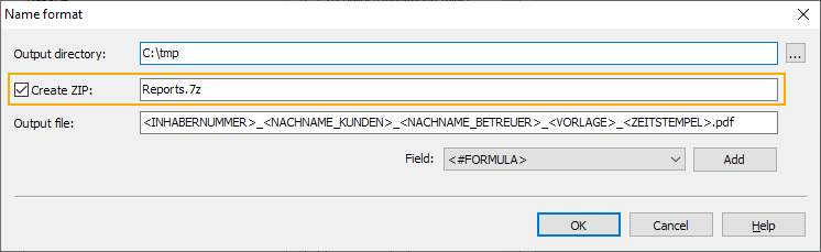 - For the name of the ZIP archive, you can also use the predefined blocks or define new name components via the <FORMULA> entry, similar to the name of the output file below.