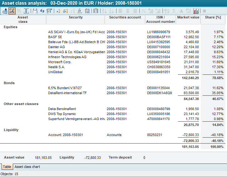 The holder "Max Mustermann" has three securities of the type "Fund" in his custody account. These funds are each assigned a weighting via the user-defined field "Asset class split". The asset class analysis then splits the funds into the individual asset classes according to their weightings. In the item description, a weight deviating from 100% is displayed with the addition "at (xx%)". In the other columns, the proportional weight is calculated accordingly.