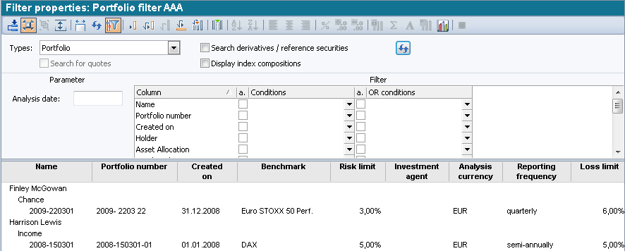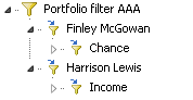 In this example, the filter template, which is based on the "Finder Portfolios", is grouped by advisor and then by the assigned asset allocation.