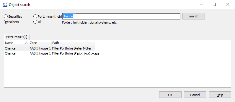 In the object search, this folder type is listed as a filter result on a separate tab; the relative path to the generating filter is displayed next to the name of the sub-filter: