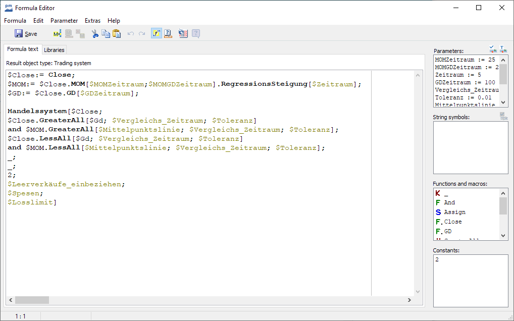 The "Labeling scheme" determines the name of the signal system in the chart display. - Use the "Formula" button to enter the formula in the formula editor; this is the heart of the trading system.