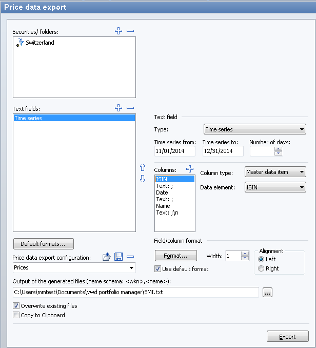 Select the "Price data export" icon on the "Reporting" tab. The "Price data export" dialog box opens.