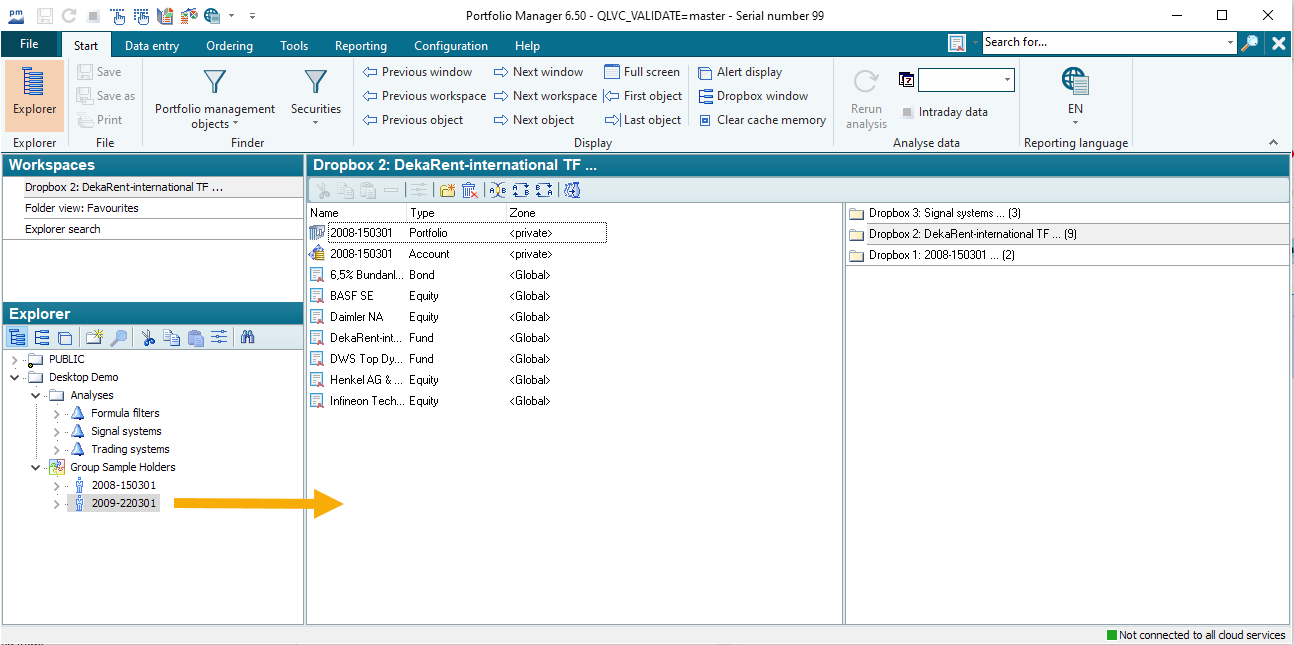 Use the "File window" icon on the "Start" tab to display the file(s) in the evaluation area (on the right). The Explorer is still displayed on the left. All files that you have created in the current session and have not yet deleted are displayed on the right-hand side of the file window. The selected file is opened in the middle window.