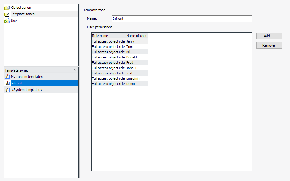 Example of zone and user authorizations