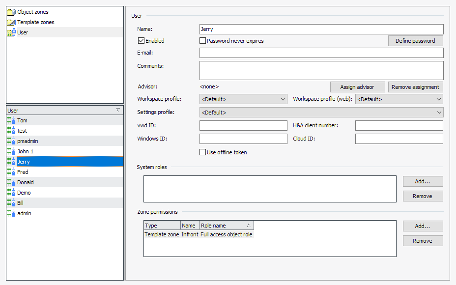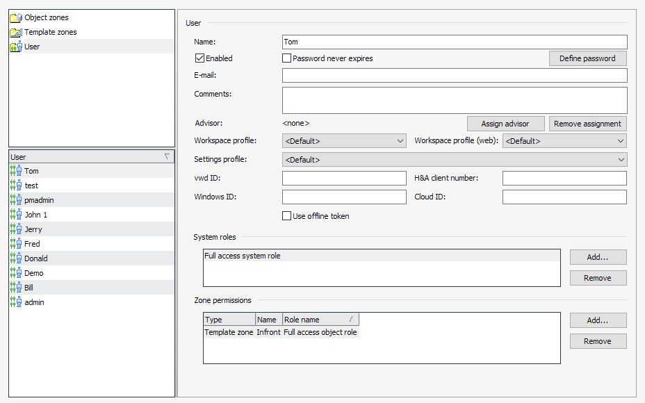 The users "Fix" and "Foxi" have a role in the "vwdkl" zone, among others. This can be viewed for selected users in the "Zone authorizations" area. If you select the "vwdkl" zone, you will see in the "User authorizations" area that the users "Fix" and "Foxi" are assigned to this zone.