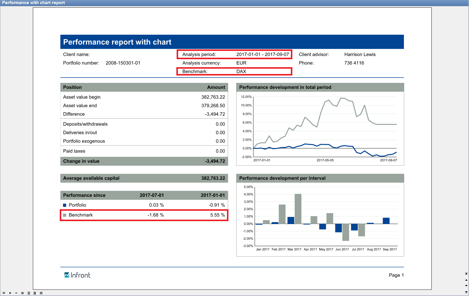 Now open the parameters of the report using the key combination <CTRL>+<A> and enter 1.11.2011 as the evaluation date and confirm this setting. The "Performance report with graph" report then looks like this.