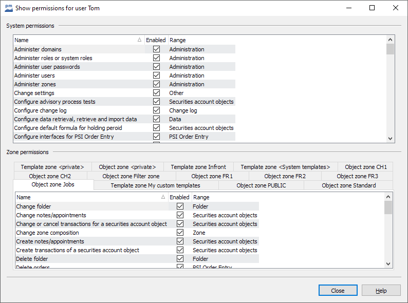 Use the individual tabs to switch to the zones you are interested in. The checkmarks in the "activated" column show you which rights are currently available for the logged-in user. - Close the dialog window with the "Close" button.