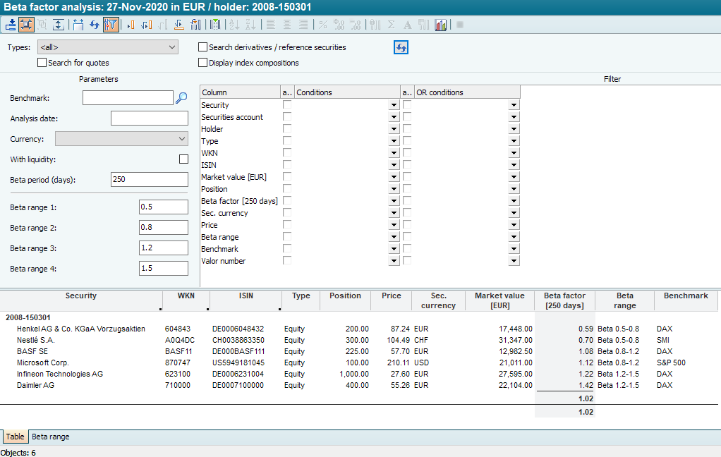 The beta factor analysis is a kind of counterpart to the duration analysis for the security type "shares". In the capital asset pricing model, the beta factor is the measure of the systematic risk assumed with a capital investment. For details, please refer to the relevant literature, e.g. Steiner, Manfred, Bruns, Christoph and Stöckl Stefan: Securities management; 10th edition.