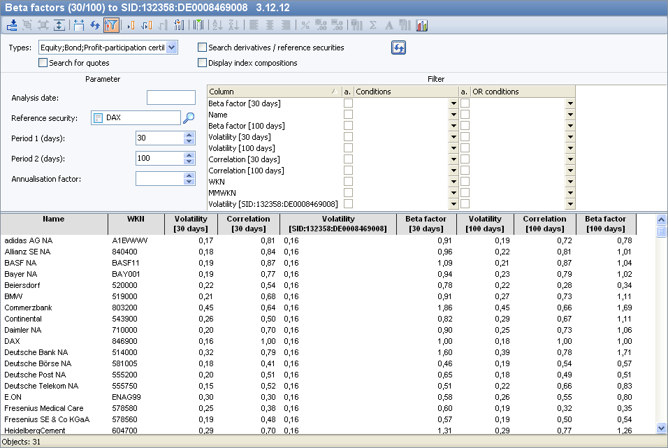 Settlement paper | A comparative value must always be specified for the calculation of the correlation and the beta factor. In most cases, this will be an index. Enter the name of the desired comparison value here. As with all names, you only need to enter part of the name. Then start the search by clicking on the "Search" icon. |