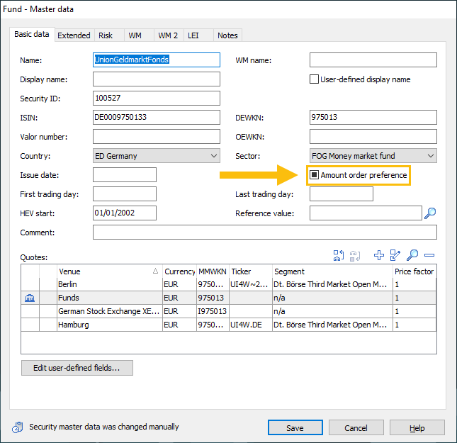 You can "override" the global amount order configuration described above in the section Configuring amount order preference for security types at security level. Proceed as follows: