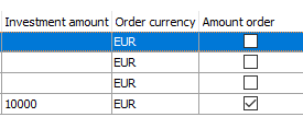 Amount orders are then marked as such in the "Amount order" column, the investment amount is shown in the "Investment amount" column and the investment currency is shown in the "Order currency" column:
