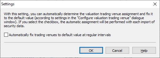 The Infront Portfolio Manager uses the configuration of the rule-based assignment of valuation places (see Configuring valuation places) to determine the default and fixes all securities in the asset universe that have not yet been fixed to the resulting valuation place.