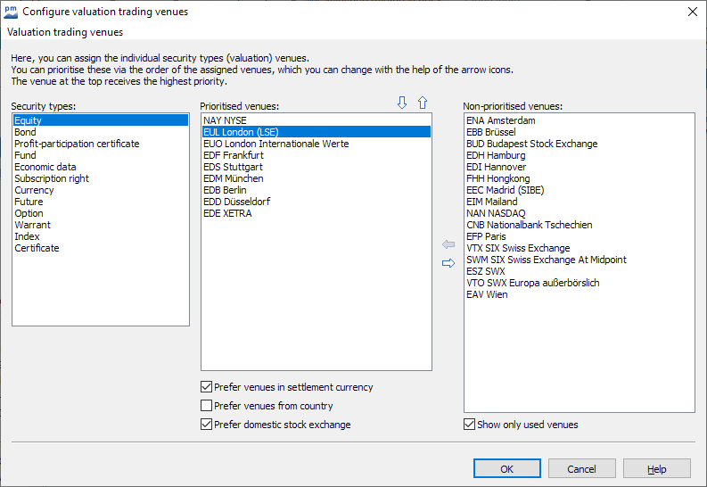 Seats assigned in this way appear at the bottom of the middle list. The order determines the prioritization of the evaluation places. The top slot is the standard valuation slot for this security type. To change the order, select an evaluation location and then select the icon with the up arrow to prioritize the location higher or the icon with the down arrow to downgrade the location. Alternatively, you can also use the corresponding arrow keys on your keyboard while holding down the<CTRL>key or simply move the places using drag & drop. If you would like to remove a place that has already been assigned for the selected security type, select the place in the middle list of the dialog box and then select the icon with the arrow pointing to the right (or the key with the arrow pointing to the right on your keyboard). Alternatively, you can also move the seats by double-clicking on the seat. Proceed in the same way for other spaces to be removed.
