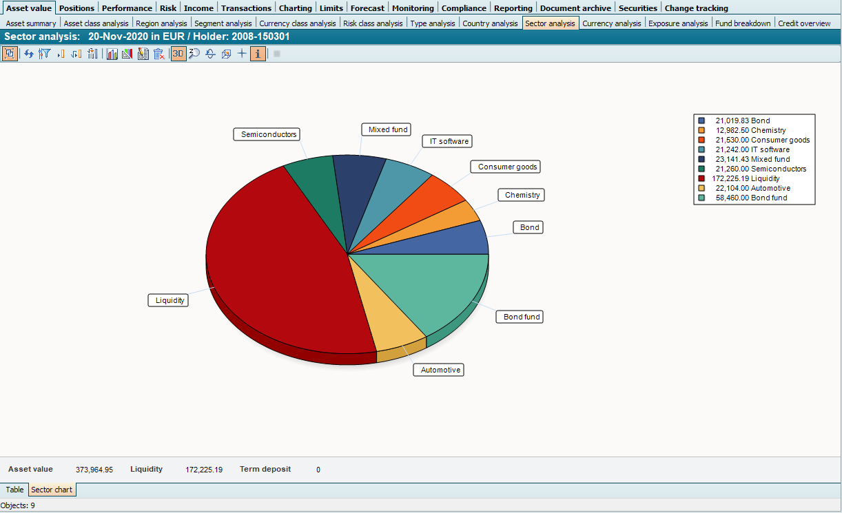 The pie chart shows the value share of the individual portfolio items grouped by sector and the share of liquidity in assets. Any existing loans with negative values are also included here.