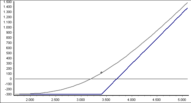 The break-even point for the call long is the strike price plus premium (in the illustration the intersection with the horizontal line at profit 0).