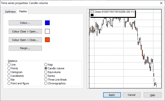To display a chart as a candle volume chart, select the time series and then select the DARSTELLUNG, CANDLEVOLUME command in the context menu.