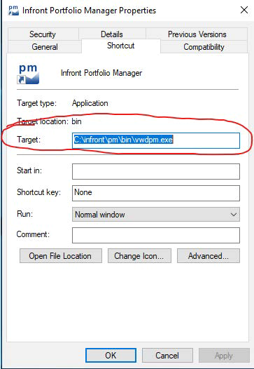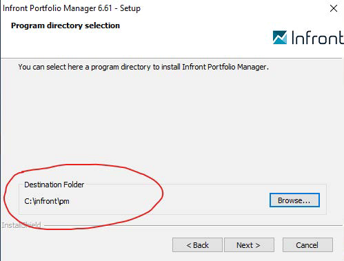 Your installation directory is the one where the “bin” folder is located, here C:\infront\pm.