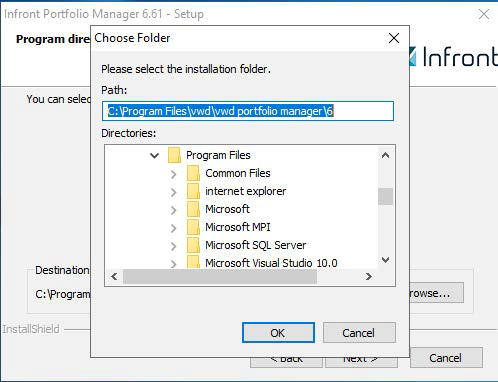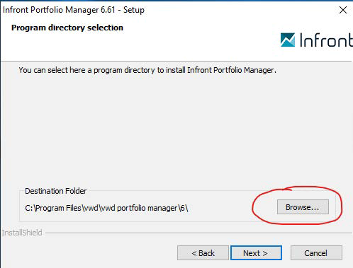 In certain constellations there is one more step to take during the update process. By default the installation directory is “C:\Program Files\vwd\vwd portfolio manager\6“, but if directory had been changed you have to choose this individual path in the update wizard.
