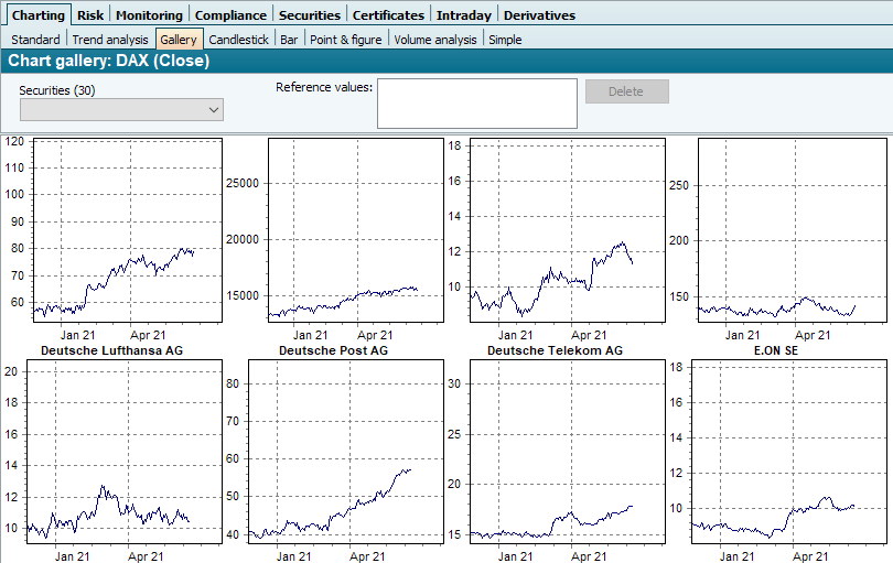 In most cases, you have several securities to choose from when making an investment, e.g. different securities in the same sector or different warrants on the same underlying. The Infront Portfolio Manager offers you the Chart Gallery so that you can compare securities clearly in such situations.